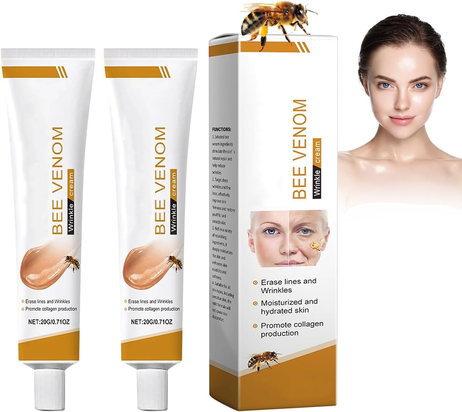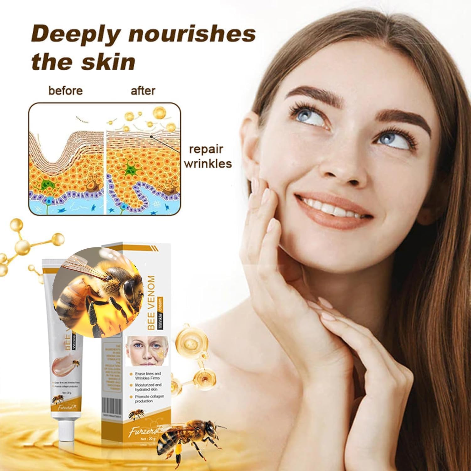Infused with bee venom, royal jelly, honey, and botanical extracts, ensuring a gentle yet powerful anti-aging effect.